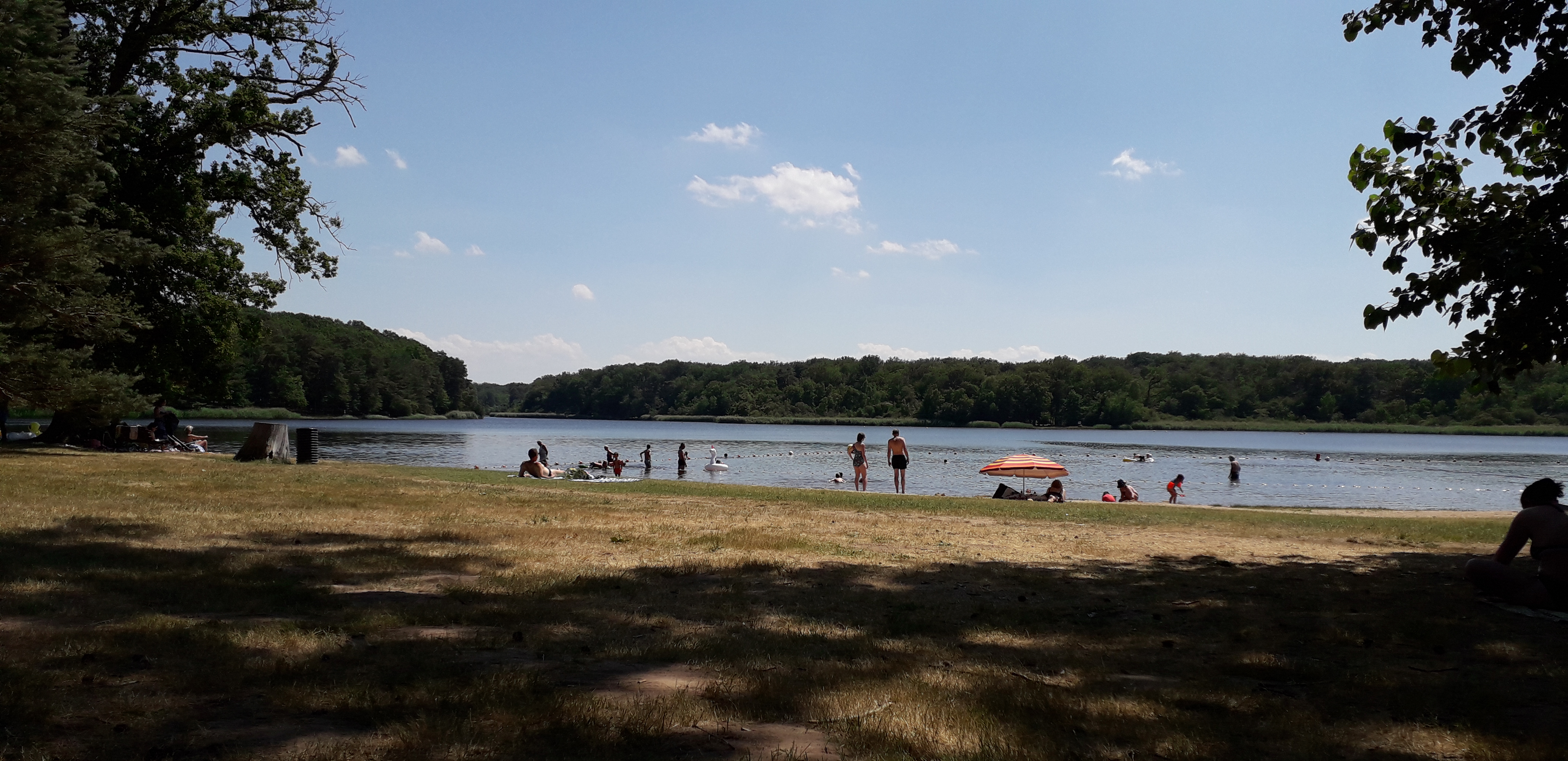 Baignade interdite par manque de maître nageur. Moins de monde que d’habitude Dommage sinon bel endroit au milieu de la forêt de Tronçais