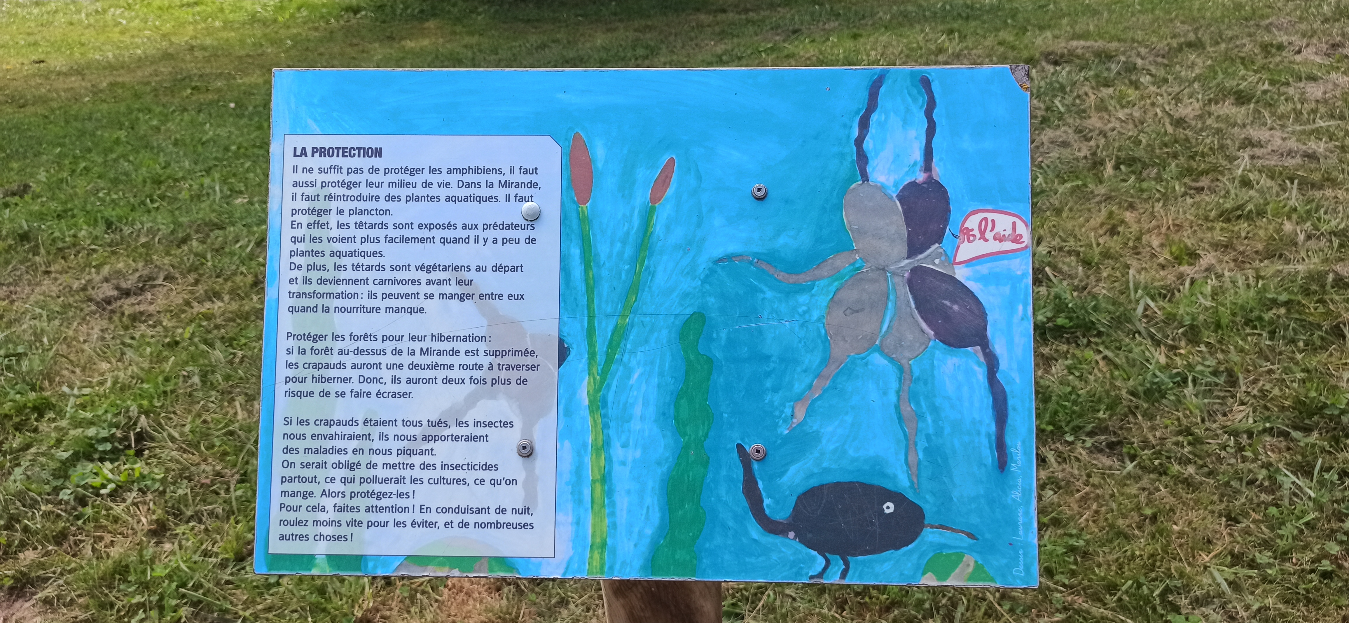 Ballade courte mais sympathique. Bonne idée d'avoir exploité des dessins d'enfants pour expliquer l'importance de préserver crapauds et grenouilles. Dommage que certains soient vandalisés. On peut aller faire un petit coucou aux chevaux. Cependant il manque des jeux pour enfants.