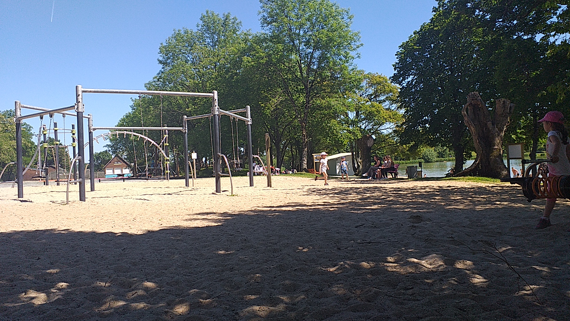 Terrain de jeu sympa, malheureusement eau avec algues bleu-vert en août 2019, donc baignade interdite.