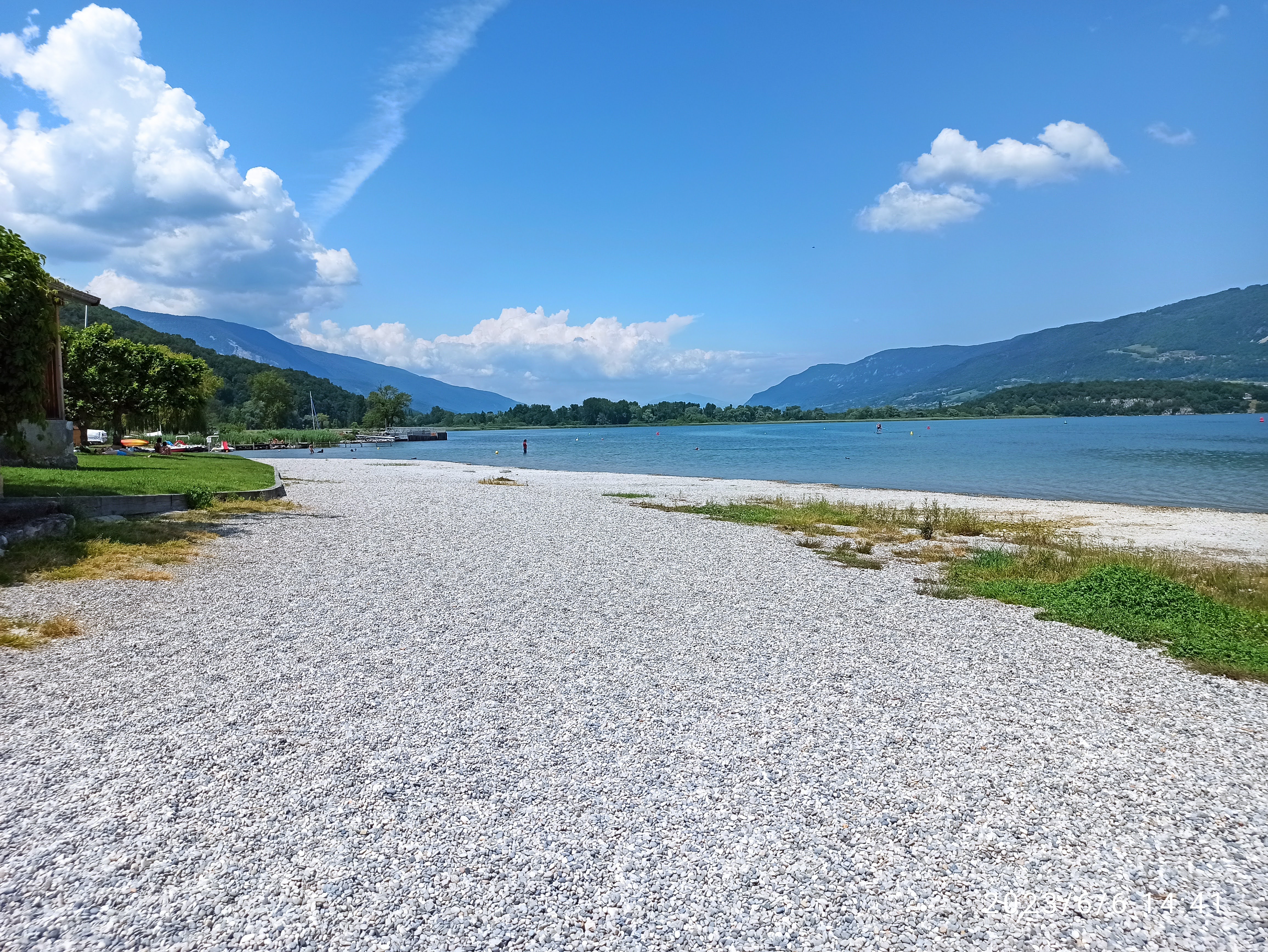 Super plage. Une partie galet et une gazon assez ombragée, snack, toilettes et douches en extérieur. L'eau du lac tourne dans les 20/25°C en été.