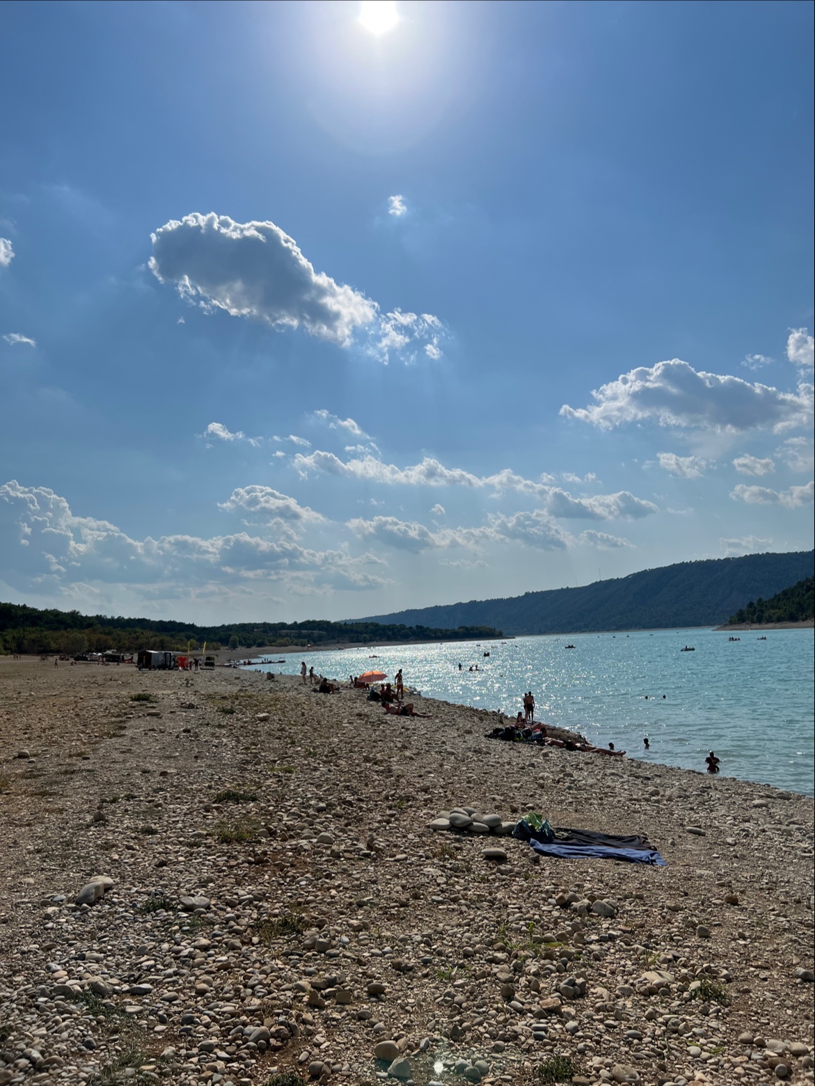 Lac de Sainte croix aux gorges du verdon.Plage de galets , prévoir les chaussures pour la baignade, peu d'herbe autour, quelques coins d'ombres en retrait.Grand parking. Possibilité de Pédalo et location bateaux, temps d'attente très long. Site magnifique.